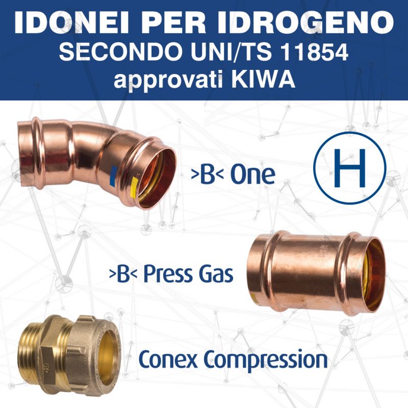 Conex Bänninger è da sempre attenta allo sviluppo di soluzioni “green” che vedono la diffusione di scelte con sempre minore impatto sull’ambiente, come l’idrogeno. Per questo i nostri raccordi delle gamme >B< Press, >B< One e Conex Compression sono già stati certificati da KIWA per l’uso con miscele di gas e idrogeno sino al 20% e possono tranquillamente essere utilizzati per le applicazioni previste dalla UNI/TS 11854.